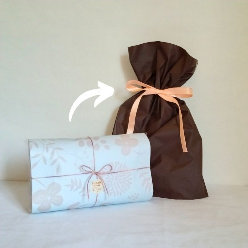 定型外郵便対応の小さな商品は、不織布バッグには入れず、包装紙とリボン・シールのラッピング方法となります。
