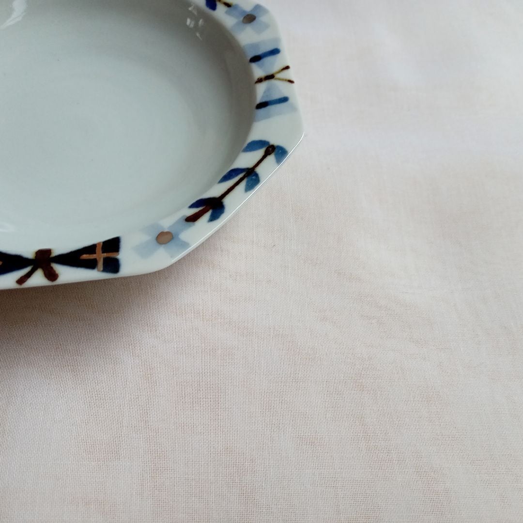 ぐるりと描かれた青が目を引く八角皿です。